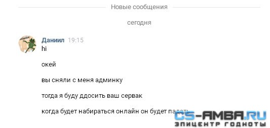 Не рекомендую с ним связываться , выдали ему временную админку на сервере , вчера забрали, и он начал ДДОСить сервер! ДДосил около часа где то , отрывками, как люди начали заходить , человек 15 набиралось ,он опять ддосил ! После этого мы начали договариваться с ним ! А он такой валенок ничего не понимающий , тех.поддержка хостинга CSSERV.RU ничего не могла сделать! но все равно ничего не начали делать , и не собирались походу! Пришлось заплатить одному человеку , но он все равно ничего не сделал, устоновил плаигны из панели , но все равно ничего не сделал ! Потом мы договорились с ним, на время! Как он ддосил: До этого слышал что у него есть панелька , он ее покупал вроде , а теперь самое главное ! Как можно защититься от ДДОС атак? Локация самая дорогая стоит AntiDdos стоит ! Ребят кто может поставить отличную защиту на 2 сервера ,пишите в ЛС мне ! Маленькие пруфы на него! Качайте внизу) Прикрепления: